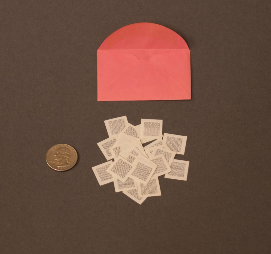 Byars, who read deeply into Stein’s writing, chose 100 sentences he liked and printed them as one-page “books” in microscopic font on tiny squares of paper. Each book was put in a pink envelope, and contrary to the wishes of the museum, given to opening night attendees, December 17, 1970.